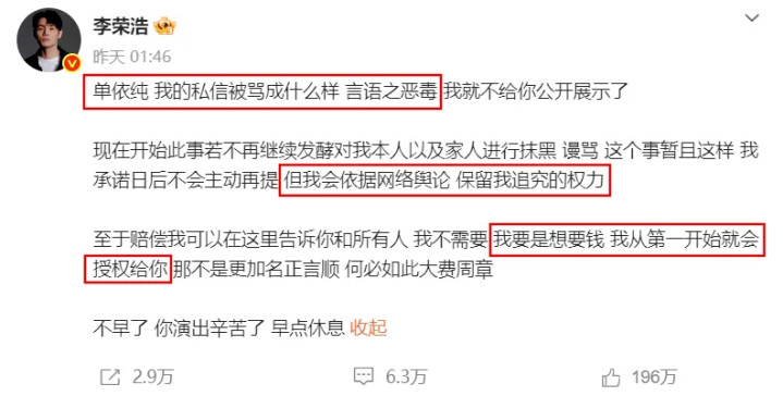 李荣浩没有顺势给台阶,而是态度强硬进一步痛斥单依纯及其粉丝行为对自己的伤害。