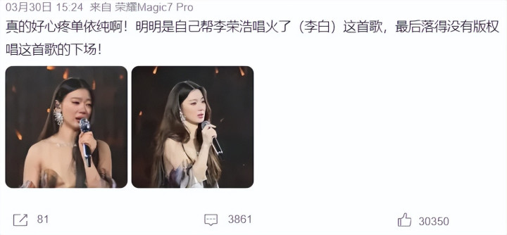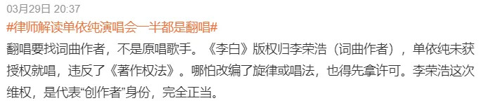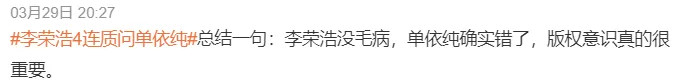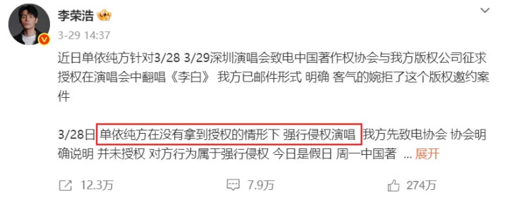3月29日下午,李荣浩连发微博,斥责单依纯侵权。