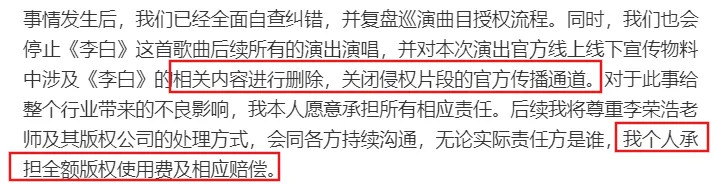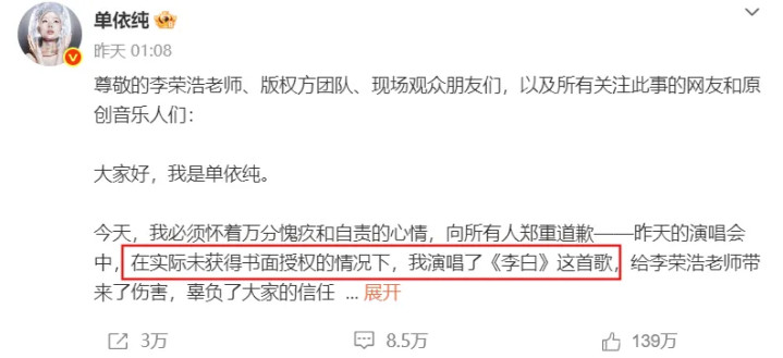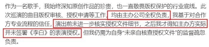 凌晨时,她发长文回应,承认自己在实际未获得书面授权的情况下,演唱了《李白》。